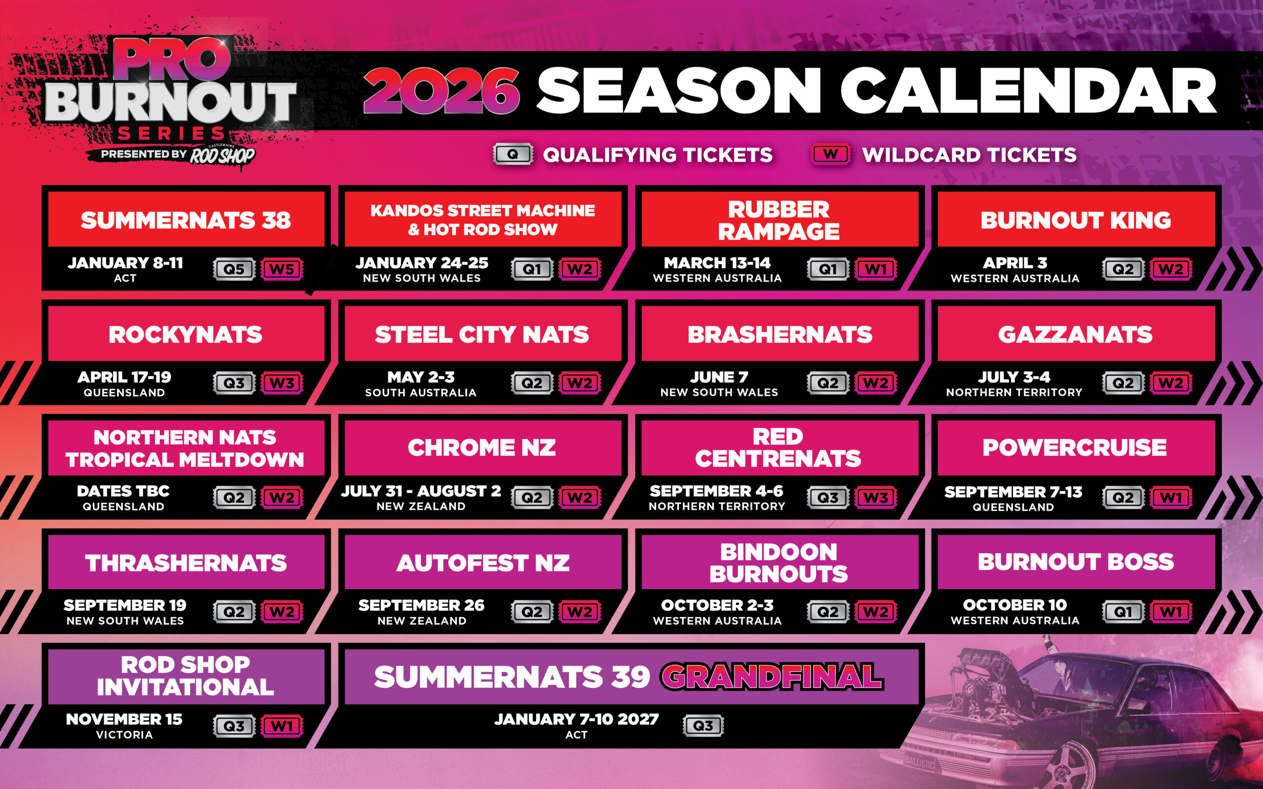 The Pro Burnout Series presented by Castlemaine Rod Shop has locked in a massive 2026 season with 18 events spanning Australia and New Zealand, culminating in a grand final showdown at Street Machine Summernats 39.