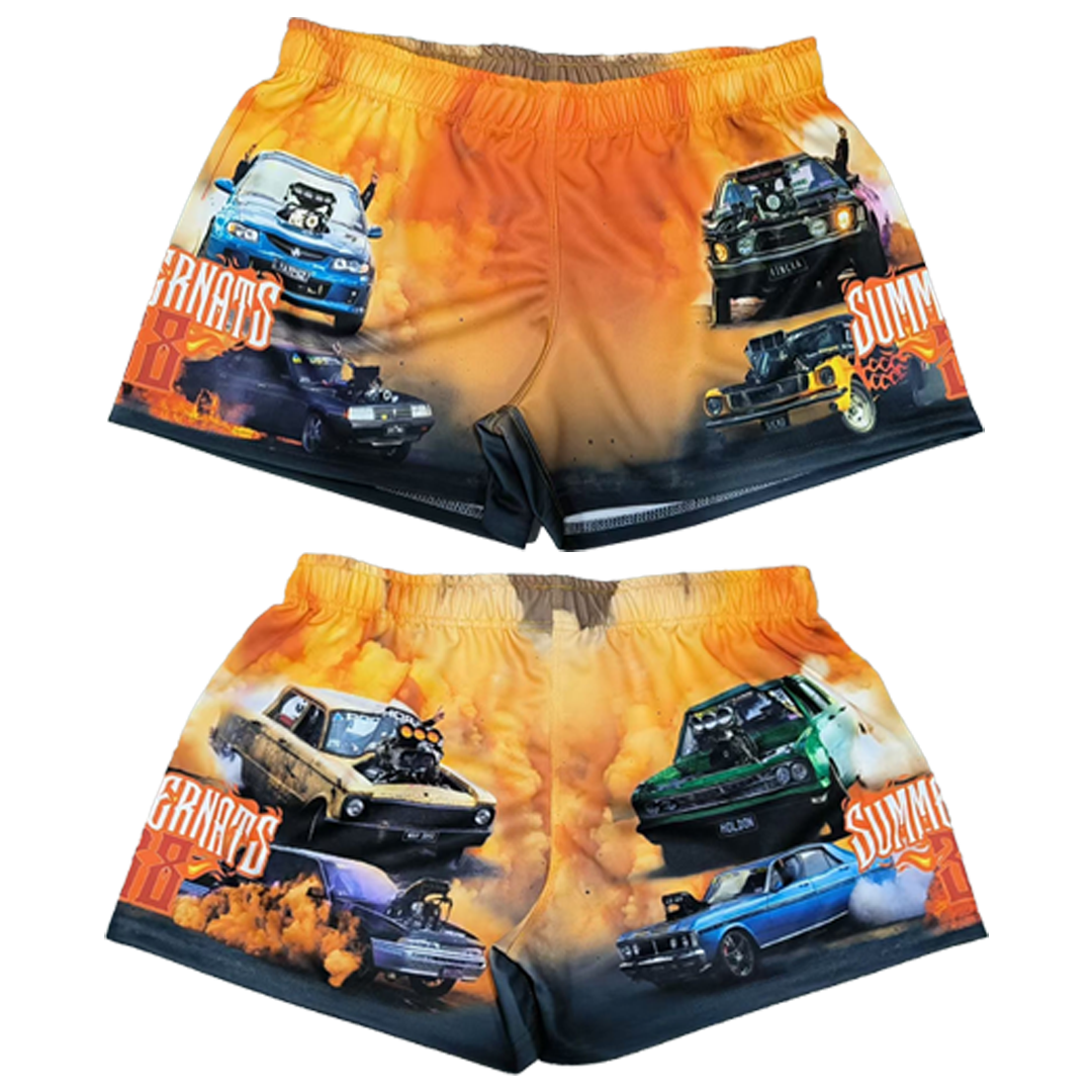 Great footyshorts with your favorite burnout cars from Summernats, comfortable and with side pockets.